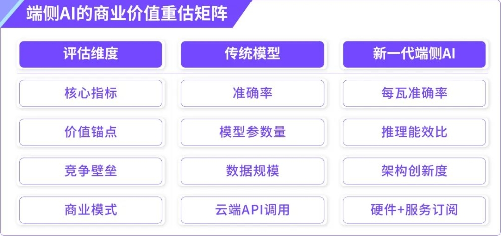 以下是一个端侧AI的商业价值重估矩阵,对比了传统模型和新一代端侧AI在不同维度上的差异: