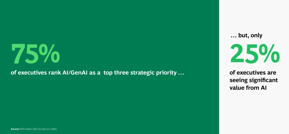 在2025年的最新研究中,BCG调研了全球1803名企业高管,发现三分之一的公司计划今年在升级技术方面投资至少2500万美元。