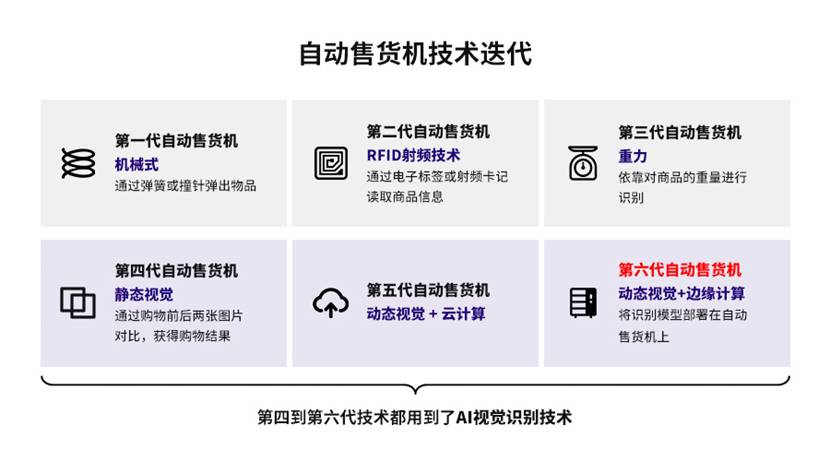在多年的发展历程中,自动售货行业经历了从机械式到RFID射频技术、重力感应、静态视觉识别,再到动态视觉+云计算、动态视觉+边缘计算等多种商品识别方式的演变。