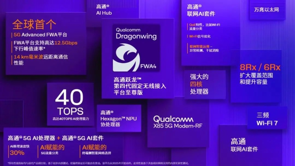 特别是MWC上推出的全球首款5G Advanced FWA平台——高通跃龙第四代固定无线接入平台至尊版,以高通X85为核心,集成前所未有的AI和连接能力,具备终端侧AI增强的流量分类功能。这款新平台还搭载了边缘侧AI协处理器,具有高达40TOPS的NPU处理能力,从而能够为连接至网络的不同终端提供生成式AI处理能力。