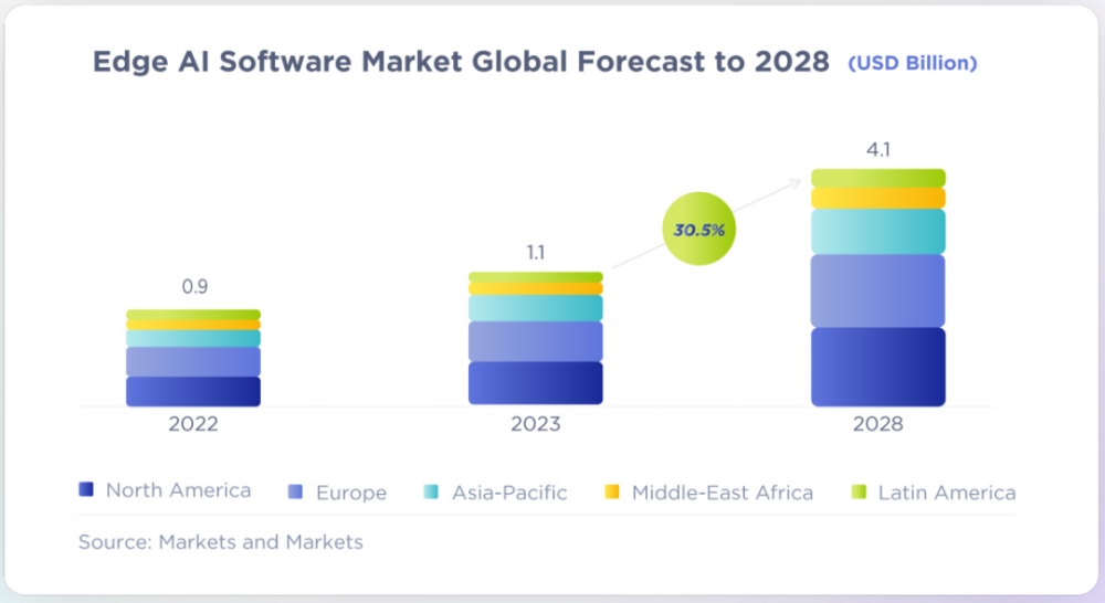 为边缘AI提供支持的软件和硬件市场也在不断增长。边缘AI软件解决方案正在成为现代数字基础设施不可或缺的一部分。这个不断增长的市场涵盖了各种工具和平台,旨在实现从物联网传感器到工业设备等边缘硬件的AI推理和训练。边缘AI软件的全球市场规模预计将从2023年的11亿美元增长到2028年的41亿美元。
