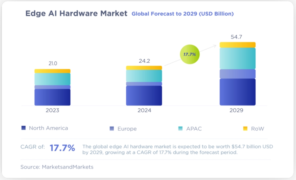 在硬件方面,根据Markets and Markets的数据,到2029年,全球边缘AI硬件市场价值预计将达到547亿美元。