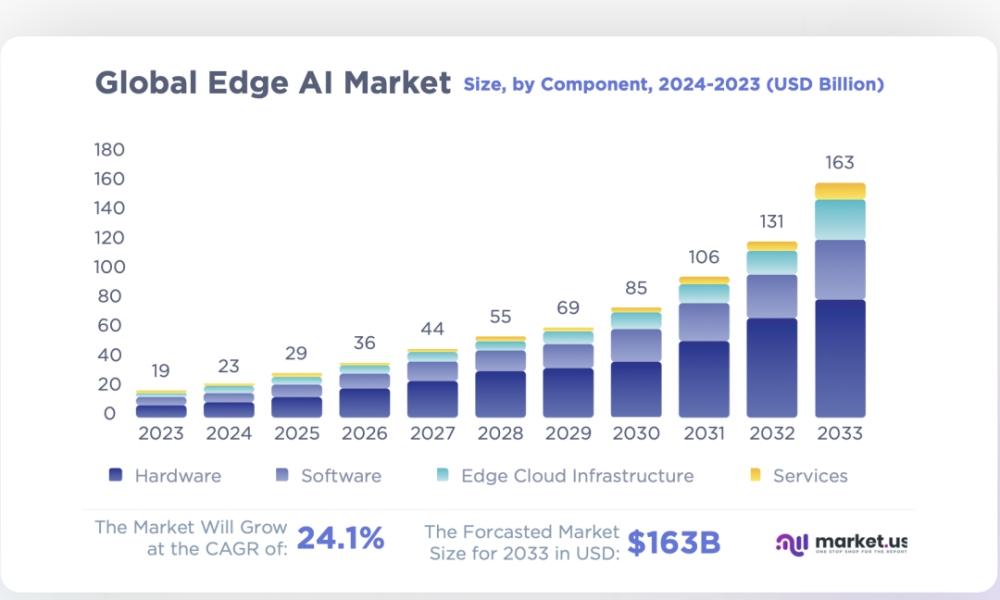 全球边缘人工智能的增长和预测显示,预计到2033年,全球边缘AI市场规模将从2023年的190亿美元增至约1630亿美元。