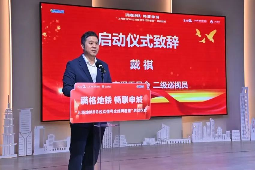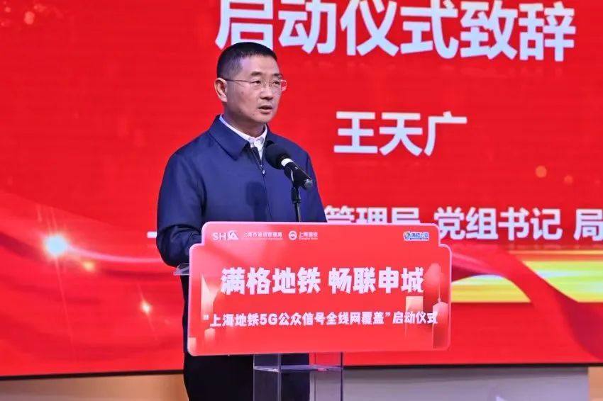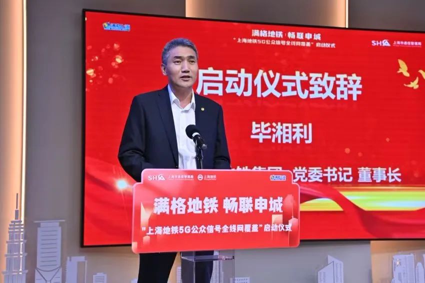 2025年4月15日上午,由上海市通信管理局和申通地铁集团组织的“满格地铁 畅联申城 上海地铁5G公众信号全线网覆盖”启动仪式在人民广场地铁站成功举行。上海市通信管理局党组书记、局长王天广、上海市交通委员会二级巡视员戴祺、上海申通地铁集团董事长毕湘利、上海市通信管理局副局长戴斌、上海移动总经理楼向平、上海申通地铁集团副总裁张郁、上海电信副总经理邵琰涛、上海移动副总经理葛澍、上海联通副总经理欧大春、上海铁塔副总经理童海鹏、东方有线副总经理季晓熙等领导出席,市通信管理局副局长戴斌主持本次仪式。本次仪式还有来自信息通信业及轨道交通业等企事业单位代表、媒体等30余人参加。
