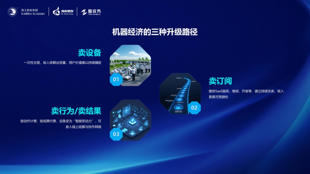 1.卖设备:一次性交付,收入依赖出货量,价值捕捉有限。 2.卖订阅:提供持续服务,建立客户关系,收入更稳、更可预测。 3.卖行为/卖结果:按动作付费、按结果结算,设备变成“可计费的智能劳动力”,嵌入链上协作网络。