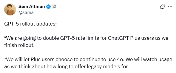 OpenAI首席执行官Sam Altman于周五迅速做出回应:将允许Plus用户选择继续使用前代版本的GPT-4o。
