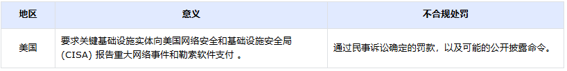 -2024 年 3 月,美国网络安全和基础设施安全局 (CISA) 发布了关键基础设施企业如何向政府报告网络攻击的规定草案,新规基于此前签署的 CIRCIA。根据新规,拥有和运营关键基础设施的公司需要在 72 小时内报告重大网络攻击,并在 24 小时内报告勒索软件支付情况。