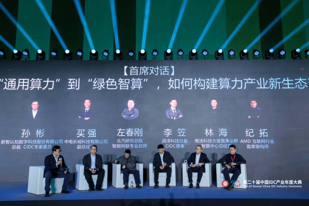 首席对话以“从'通用算力'到'绿色智算',如何构建算力产业新生态?”为主题,由新智认知数字科技股份有限公司总裁、CIDC专家委员孙彬主持,中电长城科技有限公司副总经理买强、北汽研究总院智能网联专业总师左春刚、润泽科技总裁、CIDC理事李笠、商汤科技大装置事业群智算中心总经理林海、AMD互联网行业首席架构师纪拓等嘉宾参与讨论,围绕算力产业链角色变迁、商业模式创新与转型、算力绿色化发展等话题展开深入探讨。