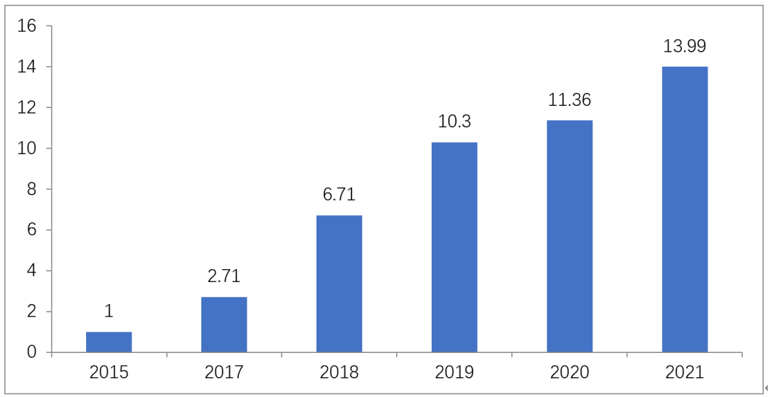 2011-2021全国移动通信基站数量(单位:万,来源:工信部,物联网智库制图)