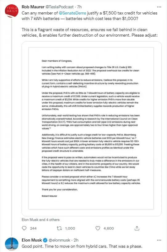 7月30日消息,特斯拉播客节目Tesla Daily的主持人罗博・毛雷尔(Rob Maurer)在社交平台发帖称,美国对混动汽车的补贴过于宽松,应加以调整。对此,特斯拉CEO马斯克在评论区赞成了罗博・毛雷尔的观点,并且声称混动汽车只是汽车发展的一个短暂阶段,现在是时候放弃混动汽车了。