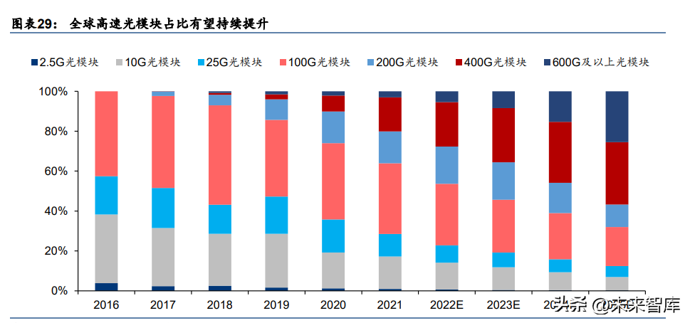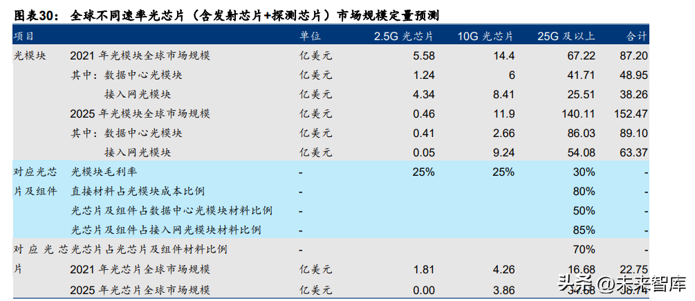 根据 LightCounting 数据: 5) 2021 年全球 2.5G 及以下光模块市场规模约 5.58 亿美元,其中数据中心市场/接入网 市场(包含光纤接入和 4G/5G 移动通信网络)分别约 1.24 /4.34 亿美元;10G 光模块 市场规模约 14.40 亿美元,其中数据中心市场/接入网市场分别约 6.00/8.41 亿美元; 25G 及以上速率光模块市场规模约 67.22 亿美元,其中数据中心市场/接入网市场分别 约 41.71/25.51 亿美元。 6) 预测至 2025 年,全球 2.5G 及以下光模块市场规模约 0.46 亿美元,其中数据中心市 场/接入网市场分别约 0.41/0.05 亿美元;10G 光模块市场规模约 11.90 亿美元,其中 数据中心市场/接入网市场分别约 2.66/9.24 亿美元;25G 及以上速率光模块市场规模 约 140.11 亿美元,其中数据中心市场/接入网市场分别约 86.03/54.08 亿美元。