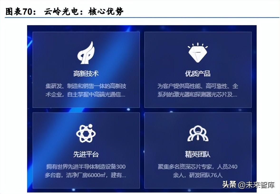 专注中高端光芯片市场,拥有自主知识产权。武汉云岭光电有限公司由国际领先的芯片专 家团队与华工科技于 2018 年 1 月共同发起设立,承载近 20 年的技术探索与市场实践,专 注于中高端光通信半导体光芯片产品,是拥有完全自主知识产权,具备全流程生产能力的 IDM 光芯片企业。 云岭光电主营业务为 2.5G/10G/25G 全系列激光器(LD)和探测器(PD)光芯片及封装类 产品。公司建有光芯片研制平台,拥有 MOCVD 材料生长,器件工艺制备,和后端测试封 装的完整生产线,从海外引入具有国外光芯片大厂多年工作经验的核心技术团队,掌握 10G/25G 高速率光收发芯片设计、高质量材料生长、关键工艺制备、和封装测试的核心技 术。公司具备年产芯片 7500 万颗、TO 7200 万只的生产能力,致力于成为世界一流的光芯 片企业,为全球光通信企业提供优质全系列光芯片。