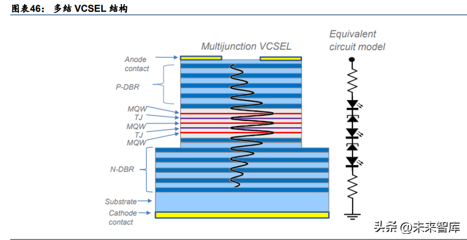 多结 VCSEL 技术发展推动 VCSEL 在车载激光雷达领域的应用。车载激光雷达应用要求 VCSEL 需具有较高的功率密度以实现长距离探测,目前常用的提升功率密度的办法为多结 VCSEL 技术。多结 VCSEL 技术在结构上通过周期性垂直地将几个 PN 结叠在一起,实现了 更高的光学效率、更高的功率密度和更高的斜率效率,有效降低器件的热负荷和封装尺寸。 2022年4月VCSEL巨头Lumentum发布五结/六结VCSEL,最高功率密度超过1400W/mm2, 国内方面纵慧芯光、长光华芯等公司均已实现五结 VCSEL 产品突破。