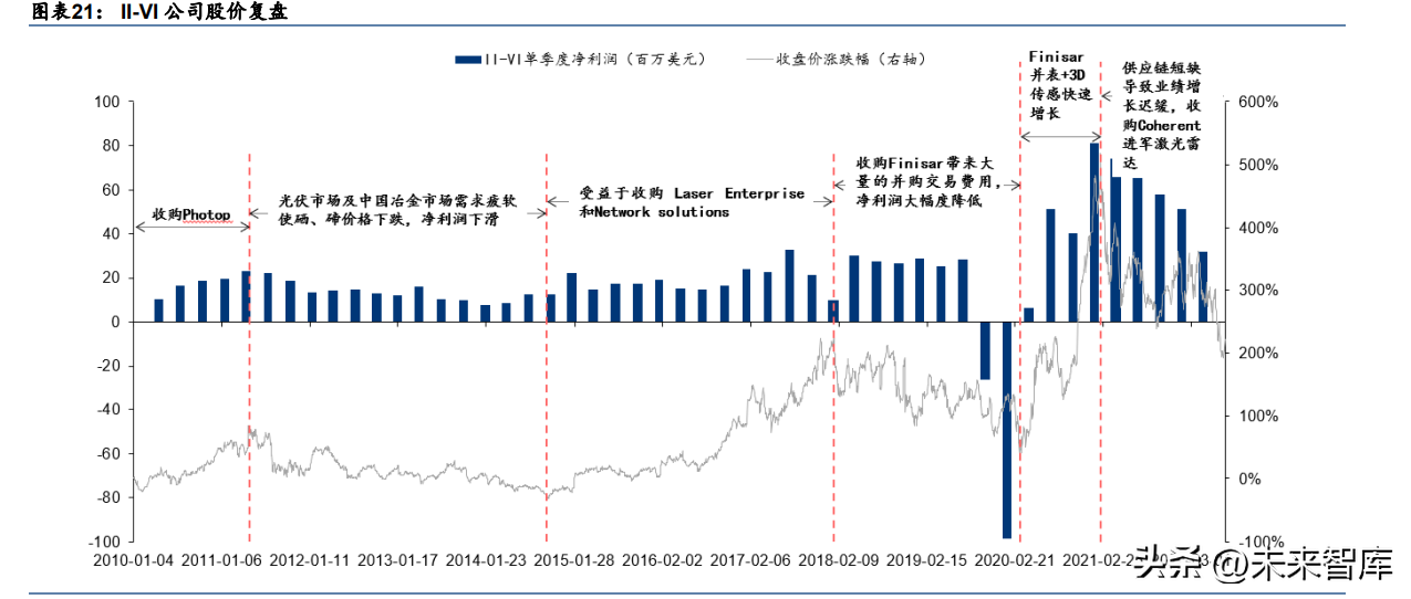 II-VI 公司成立于 1971 年,于 1987 年登陆纳斯达克上市。II-VI 公司发展初期业务聚焦于碲 化镉等 II-VI 族化学元素相关材料,用于二氧化碳激光器中的核心光学元器件等。步入 20 世纪 90 年代后,II-VI 开始尝试通过外延并购的方式实现业务领域的扩张,早期具有里程碑 意义的收购包括 2000 年 II-VI 收购 Laser Power Optics 公司,强化了自身在红外光学领域 的竞争地位;以及 2010 年收购高意(Photop),该收购开启了 II-VI 公司进军光通信市场的 帷幕。近年来 II-VI 公司的重要收购包括 2018 年收购全球光通信领域头部公司 Finisar,以 及 2022 年收购全球激光器及激光设备领先企业 Coherent 等。下文中我们重点对 2010 年 后(即收购高意后)II-VI 公司发展历程进行复盘,分析各阶段其业绩变化背后的驱动因素 及股价表现。