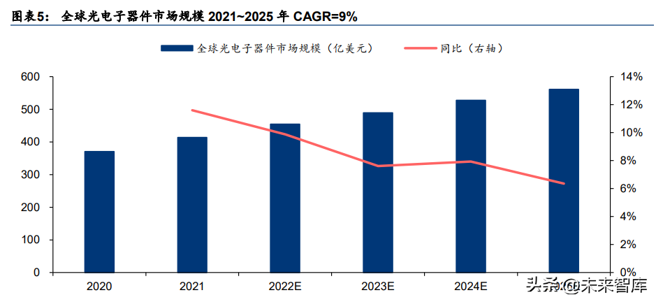 全球光电子器件市场规模持续增长,2025 年市场规模有望突破 560 亿美元。光芯片涵盖工 业用高功率激光芯片、通信用高速率激光芯片、手机人脸识别用 VCSEL 等成熟应用,以及 车用激光雷达和硅光芯片等未来有望实现爆发性增长的新领域。我们认为在通信、工业等 领域的应用深化,以及在车载激光雷达等新兴领域的拓展,光芯片市场规模有望持续增长。 根据 Gartner 数据,2021 年全球光芯片(含 CCD、CIS、LED、光子探测器、光耦合器、 激光芯片等)市场规模达 414 亿美元,预计 2025 年市场规模有望达 561 亿美元,对应期 间 CAGR=9%。