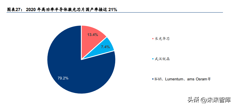 2020 年国产高功率激光芯片份额占比超 20%。高功率半导体激光芯片方面,美国和欧洲起 步较早,技术上具备领先优势,传统国际巨头包括 II-VI、Lumentum、ams Osram、IPG 等(其中 IPG 主要为自用);国内半导体激光芯片行业随着技术的不断突破,处于快速发展 期,主要厂商包括长光华芯、武汉锐晶、度亘激光、华光光电、深圳瑞波等。根据长光华 芯招股书测算,2020 年长光华芯、武汉锐晶占国内高功率半导体激光芯片市场份额分别达 13.4%/7.4%,国产率近 21%。我们认为未来在长光华芯、武汉锐晶等公司持续开拓下,半 导体激光芯片国产化进程有望持续迈进。