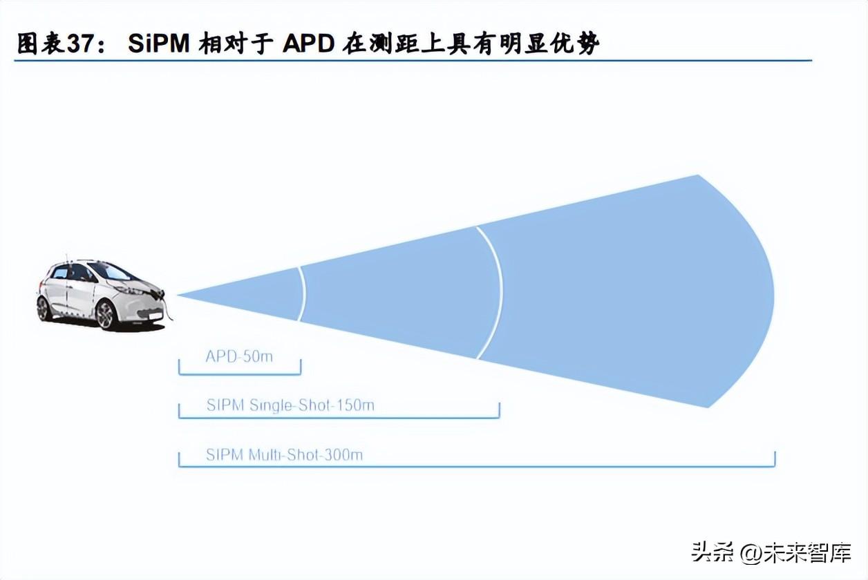 2)激光雷达领域:APD 是现行成熟方案,SPAD/SiPM 是未来发展趋势 。APD 目前应用最广泛,而 SPAD 和 SiPM 是未来之选。对于激光雷达领域,APD 也是目前 应用最广泛的探测芯片方案,因其具备 10-100 倍的增益能力,能在低光强环境下完成有效 探测。激光雷达未来会更倾向于 SPAD/SiPM(SiPM 本质上是 SPAD 的阵列形式),原因是: SPAD/SiPM 相对 APD 具备两大优势:1)SPAD/SiPM 是工作在盖革模式下的雪崩二极管, 理论上的增益能力是 APD 的 100 万倍以上,可在更低的光强环境下完成探测任务;2)SiPM 是多个 SPAD 的阵列形式,与未来的阵列式光源契合,并可获得更高的可探测范围,也更 易集成 CMOS 工艺。国外知名激光雷达厂商 Ouster、ibeo、Opsys 等均已在布局 VCSEL+SPAD 方案的激光雷达,预计将于未来三年内陆续推出。