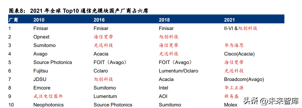 光模块、光纤激光器、激光雷达等产业链中下游环节国产化进展顺利。目前我国光模块、 光纤激光器、激光雷达等下游细分领域已具备较强竞争实力,推动相关领域国产化进展持 续迈进。 光模块方面,根据 Lightcounting 于 2022 年 5 月发布的统计数据,2021 年全球前十大光模 块厂商,中国厂商占据六席,分别为旭创(与 II-VI 并列第一)、华为海思(第三)、海信宽 带(第五)、光迅科技(第六)、华工正源(第八)及新易盛(第九);相比于 2010 年全球 前十大厂商主要为海外厂商,国内仅 WTD(武汉电信器件有限公司,2012 年与光迅科技 合并)一家公司入围,体现出十年以来国产光模块厂商竞争实力及市场地位的快速提升;