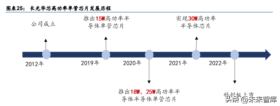 激光芯片厂商通过持续提升产品输出功率巩固竞争实力。以国产高功率半导体激光芯片厂 商长光华芯产品发展历程来看,长光华芯成立于 2012 年,成立之初研发出 13W 以上高亮 度单管芯片;2019 年推出 15W 单管芯片,2020 年推出 18W、25W 单管芯片,2021 年实 现 30W 单管芯片量产,产品向更高功率段持续快速迭代。