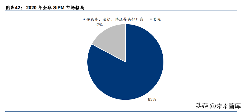 全球 SiPM 市场集中度较高。根据 QYResearch 数据,全球 SiPM 市场主要集中于头部企 业,2020 年以安森美、滨松、博通为首的头部厂商合计市占率达到 83%,SiPM 产品技术 难度大,进入门槛高,且业内收购事件频繁,新进入者较难立足。