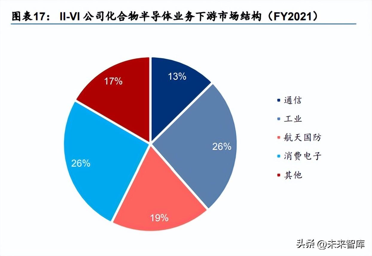 II-VI、Lumentum 等厂商市场布局全面,通信、工业、消费、国防等全面布局。根据我们 的梳理,II-VI、Lumentum 等海外领先的光芯片/光器件厂商布局的市场领域较为全面,其 中 Lumentum 公司 2021 财年营收为 17.4 亿美元,同比增长 3.8%;业务结构方面,电信& 数通产品、工业&消费产品、激光器产品营收占比分别为 61%、32%、7%。II-VI 公司方面, 2021 财年营收为 31.1 亿美元,同比增长 30.5%;业务结构方面,总体可分为光子解决方 案和化合物半导体两大板块,其中化合物半导体业务所切入的下游领域中,消费电子市场、 工业市场营收贡献均约为 26%,其次分别为国防(19%)、通信(13%)、其他(包含医疗、 汽车电子等,约占 17%)。可以看到海外光芯片/光器件厂商所切入的下游市场中,通信、 工业、消费、国防等领域均实现了较为全面的布局。