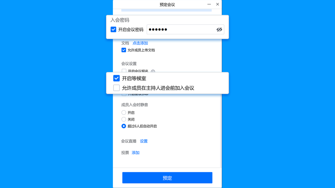 设置方法:预订会议>关闭“允许成员在主持人进会前加入会议”,开启等候室和会议密码