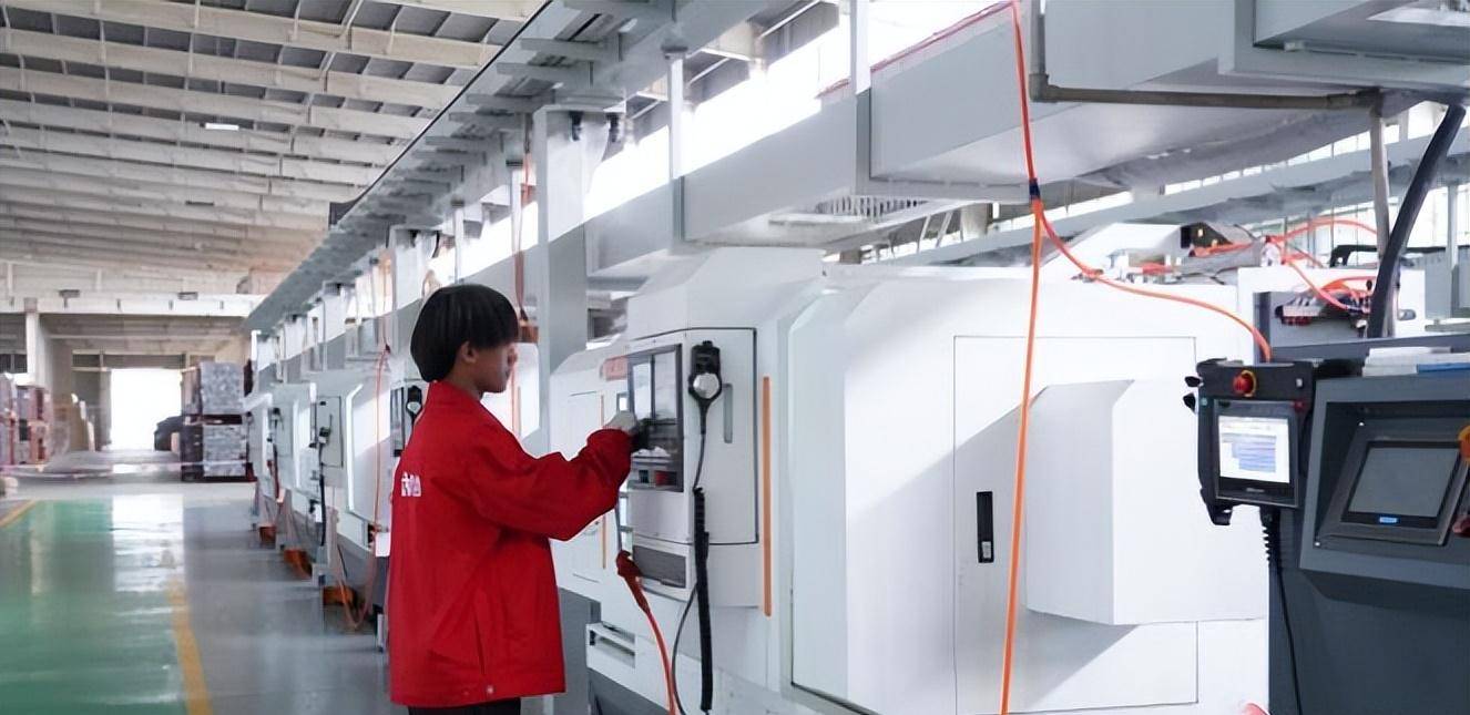 9台数控机床一字排列,一个机器人在智能导轨上来回滑行,一会儿为数控机床更换刀具,一会儿提取加工部件进行装夹,一会儿取出成品部件精准入库……数控机床自动进行部件加工、质量检测。系统看板上显示正在加工的产品种类、规格及设备管理运行状态等数据,整个生产过程全部由机器自主完成,实现无人制造。