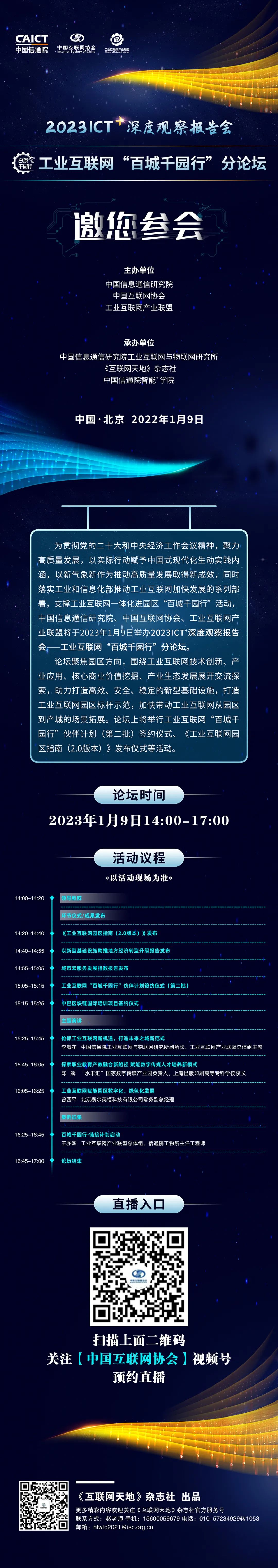 为贯彻党的二十大和中央经济工作会议精神,聚力高质量发展,以实际行动赋予中国式现代化生动实践内涵,以新气象新作为推动高质量发展取得新成效,同时落实工业和信息化部推动工业互联网加快发展的系列部署,支撑工业互联网一体化进园区“百城千园行”活动,中国互联网协会、中国信息通信研究院、工业互联网产业联盟将于2023年1月9日举办2023ICT+深度观察报告会——工业互联网“百城千园行”分论坛。论坛将通过中国互联网协会视频号进行直播。