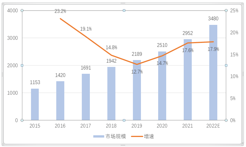 2015-2022年中国传感器市场规模及增长情况(亿元)