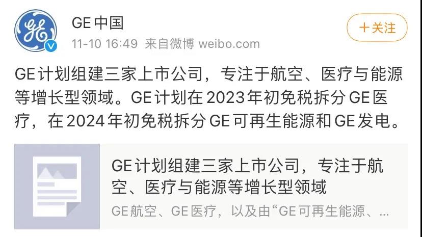 昨日,一条消息在笔者的朋友圈内引起了广泛讨论——老牌工业巨头通用电气(General Electric,下称GE)要分拆了!