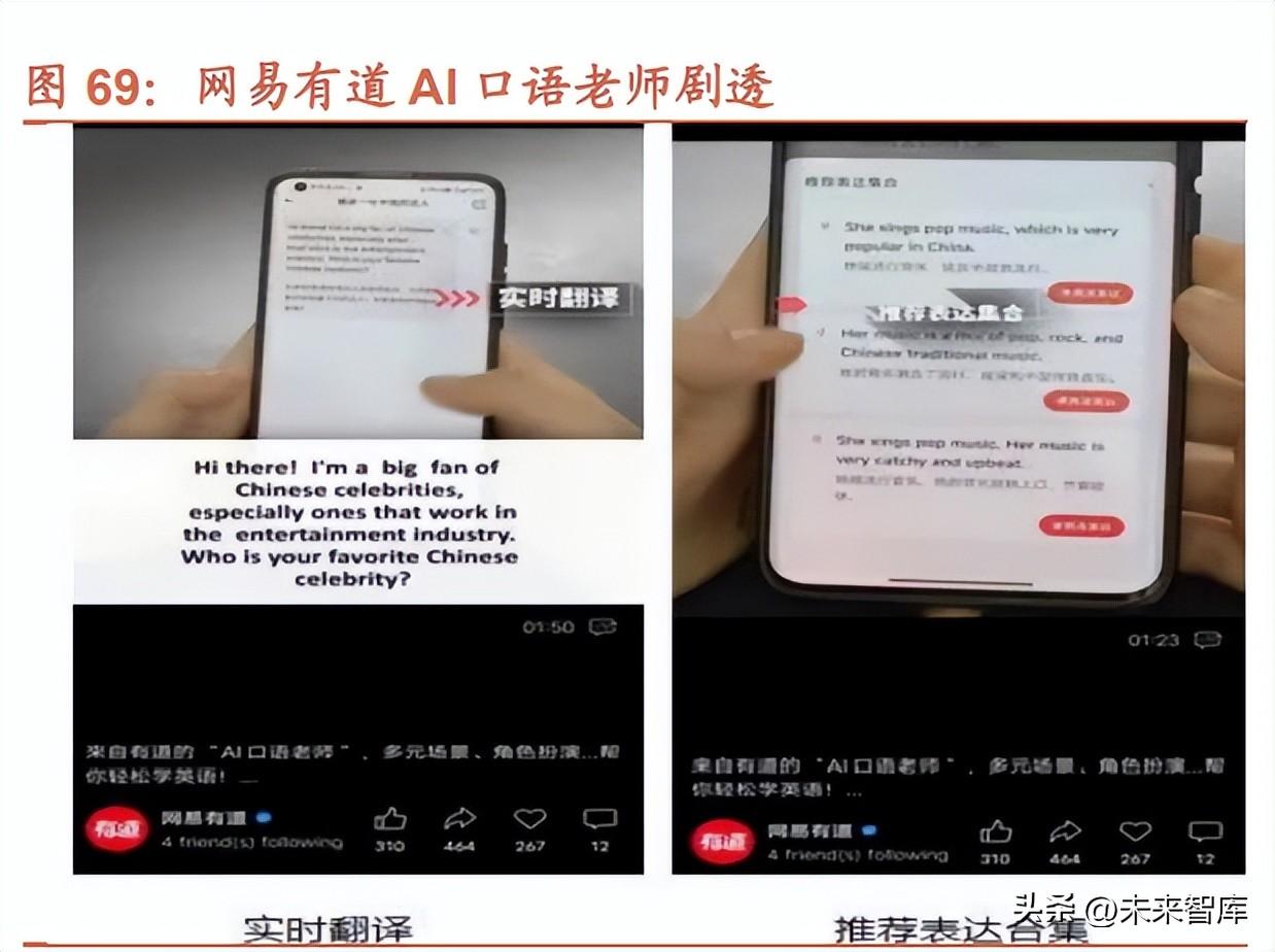 新东方、好未来等大型教育集团和科技集团均推出 AI+教育。新东方以智能答题器等硬件入手,结合智能设备可登录 的 APP 等,通过学生答题和迭代测试情况,得到学生学习曲线、遗忘曲线、知识点归因等分析,推出综合个性化学 习方案。好未来教育于 2 月初上线 AI 讲解机器人,且未来将利用 ChatGPT 相关技术对学习机等产品进行迭代。5 月 5 日,网易有道发布了基于“子曰”大模型开发的 AI 口语老师剧透视频,不同于以往只会进行死板剧本式对话的 AI 口语老师,该 AI 口语老师为用户提供了开放式的聊天场景,更符合真实的口语练习环境,并能够在结束对话后快速 生成结果报告。同日,学而思传出正自研数学大模型 MathGPT,且与年内推出基于该大模型的产品级应用。5 月 6 日,科大讯飞发布讯飞星火认知大模型,并展示了“大模型+AI”的功能,其中包含批改语文或英语作文,模拟口语老 师实景对话等。