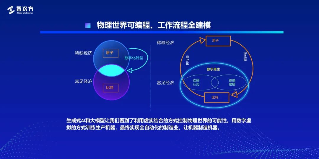 生成式AI和大模型让我们看到了利用虚实结合的方式控制物理世界的可能性,生产计划和生产执行的流程可以让机器人充分介入,用数字虚拟的方式训练生产机器,最终实现全自动化的制造业,让机器制造机器,让我们获得实体产品的成本快速降低。