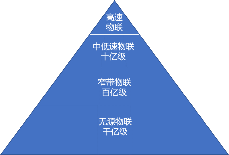 众所周知,物联网主要分为高速物联、中速物联和窄带物联三个不同的速率档位,其中大概占比为“10%-30%-60%”的金字塔分布已经成为业界共识。其中高速物联主要通过5G eMBB、LTE Cat.4+来承载,中速率档位主要以LTE Cat.1来承载,最大盘的窄带物联网则是以NB-IoT、Lora来承载。但这些都是基于有源物联网技术而实现的。