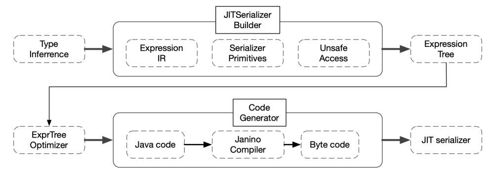 对于 Java 语言,Fury 实现了一套运行时代码生成框架,定义了一套序列化逻辑的算子表达式 IR,在运行时基于对象类型的泛型信息进行类型推断,然后构建一颗描述序列化代码逻辑的表达式树,根据表达式树生成高效的 Java 代码,再在运行时通过 Janino 编译成字节码,再加载到用户的 ClassLoader 里面或者 Fury 创建的 ClassLoader 里面,最终通过 Java JIT 编译成高效的汇编代码。