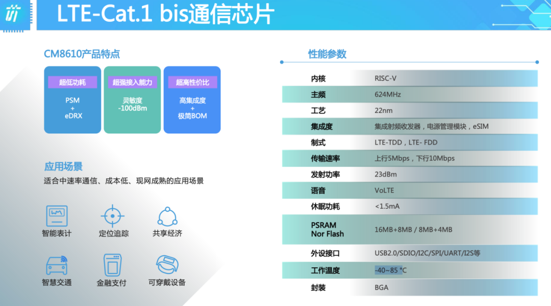 另一款产品为LTE-Cat.1 bis通信芯片CM8610,依托RISC-V内核,主频624MHz,22nm制程,集成射频收发器、电源管理模块及eSIM,上行速率5Mbps,下行10Mbps,灵敏度为-100dBm,结合PSM及eDRX模式,其休眠功耗小于1.5mA。