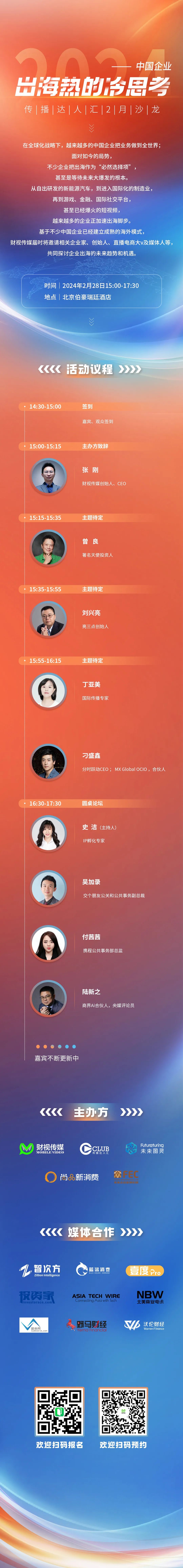 如今,中国企业的全球化之路已经迈入了一个崭新的篇章。他们不再只是走出国门,更是要在全球市场上与世界各地的企业一争高下。但挑战依然存在,海外文化差异、品牌建设、人才引进、本土企业竞争等等,都是他们需要面对的难题。要在这片广阔的海洋中航行得更远,中国企业要做对什么,才能在全球化的大潮中乘风破浪,驶向更远的彼岸?2024年传播达人汇二月沙龙活动如期而至,2月28日,由财视传媒、传播达人汇、未来图灵、尚品新消费、未来企业家俱乐部联合主办的“中国企业出海热的冷思考”主题沙龙将在北京举办。届时,活动将诚邀各个领域的探索者与先行者,共聚一堂、交流碰撞,分析中国企业出海的发展趋势与机遇。