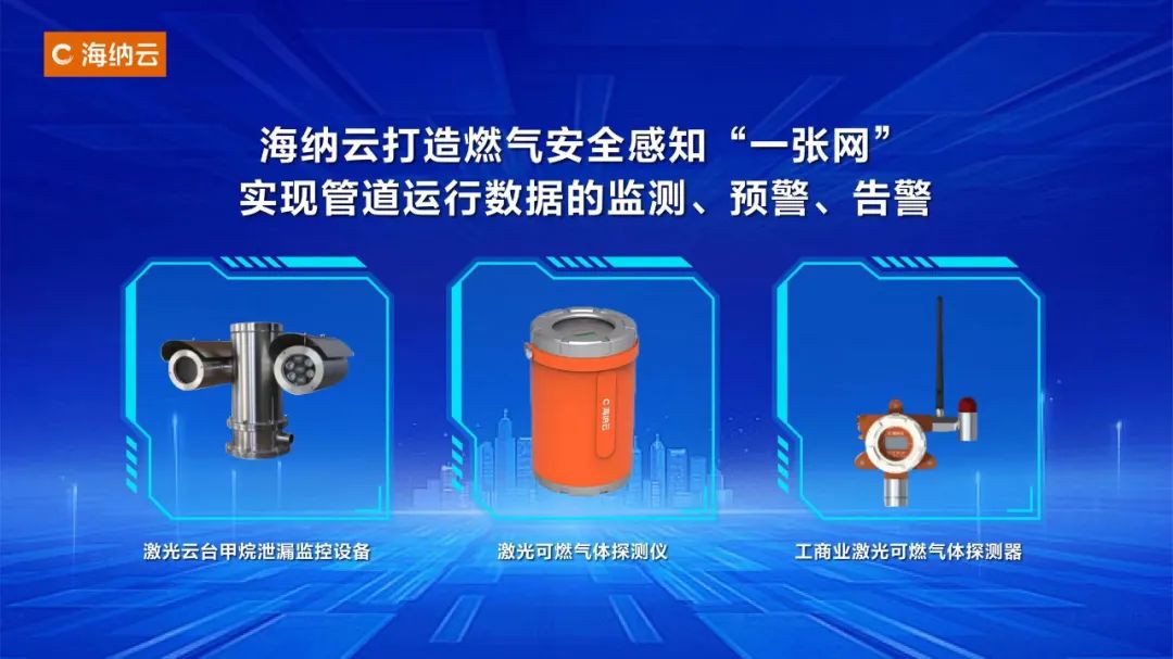 在前端感知布置上,海纳云同样以高技术含量率先示范。其自主研发“激光可燃气体探测仪”“工商业激光可燃气体探测器”等感知设备,基于TDLAS甲烷检测技术,可高灵敏监测预警燃气泄漏,成为守护燃气管道安全的“探照灯”“千里眼”。