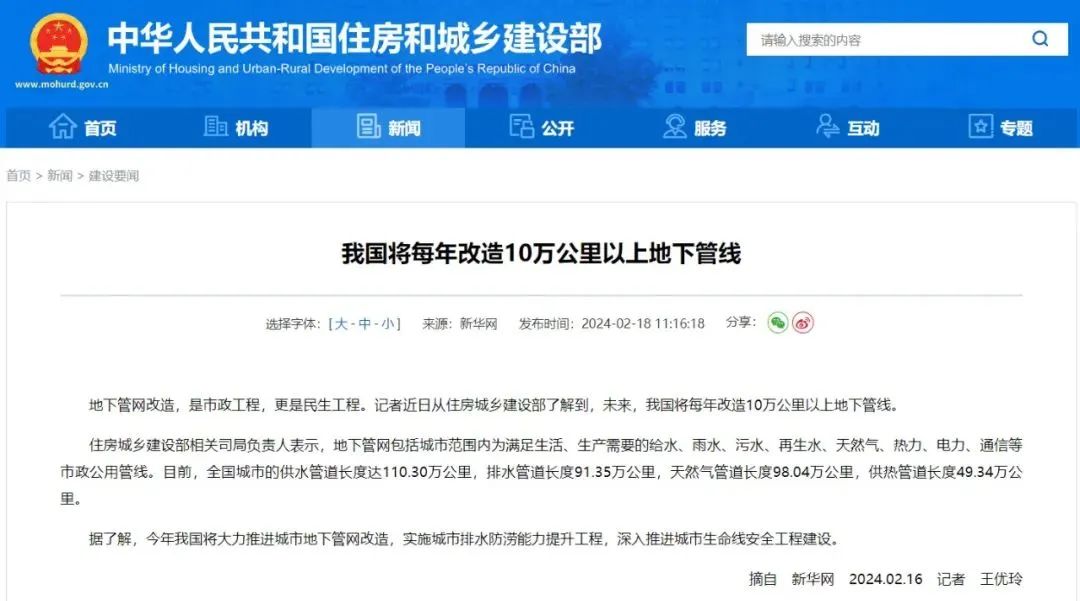 此外,2024年政府工作报告中也提出“加快完善地下管网”;住建部部长倪虹也提到,继续加大城镇燃气、供水、污水、供热等老旧管道改造力度,全年再改造10万公里以上。