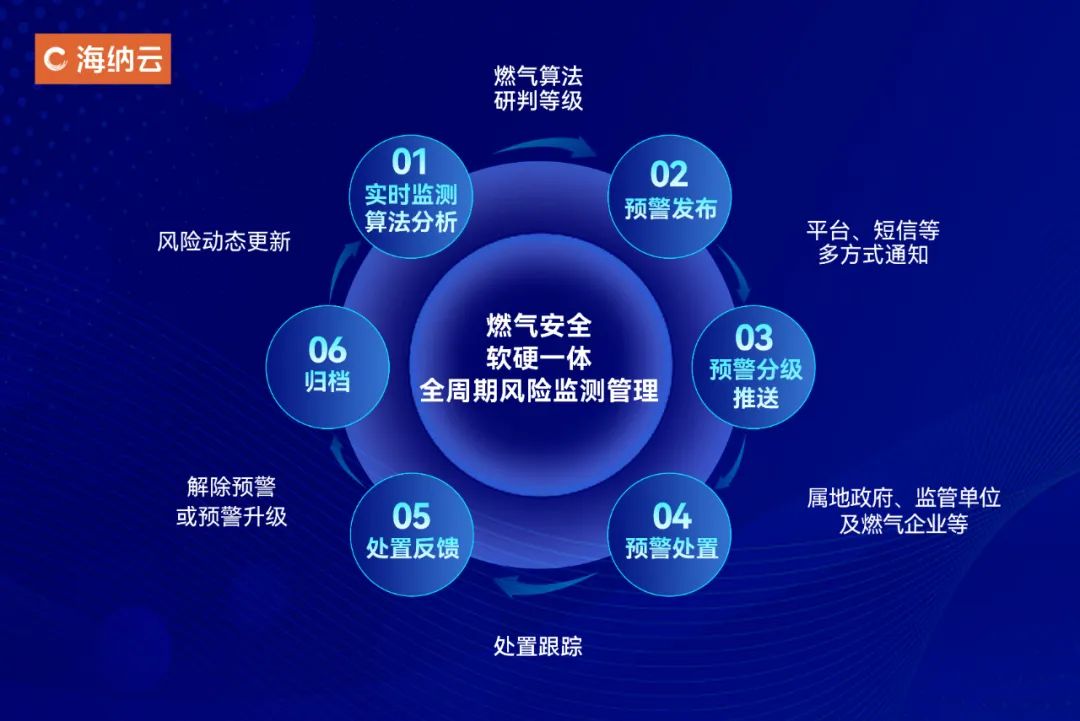 海纳云作为其中一家代表性企业,以数字技术赋能为基础,构建了行业领先的软硬一体化的“燃气安全综合监测解决方案”,“人防”+“物防”+“技防”融合,为住建、城管、应急等政府监管部门,燃气公司、工商业用户等提供“监测、预警、处置”全周期赋能。