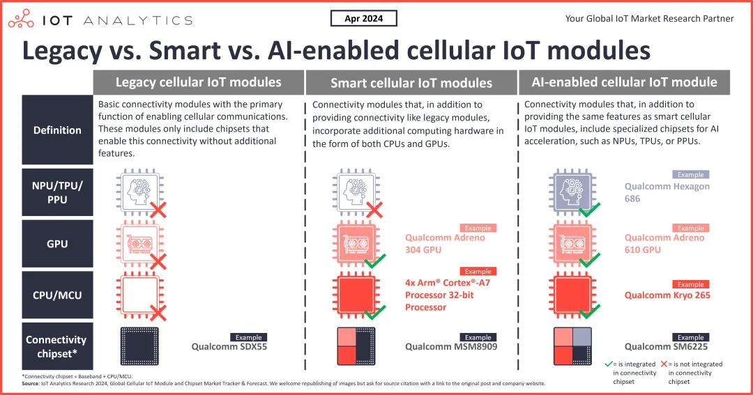 与传统模组和智能模组相比,支持人工智能的蜂窝物联网模组相对较新,上市时间超过 5 年。除了具有其他类型蜂窝物联网模组的连接功能外,支持人工智能的版本还包括用于人工智能推理的 NPU、TPU、PPU 或其他专用并行处理芯片组(如 GPU)。