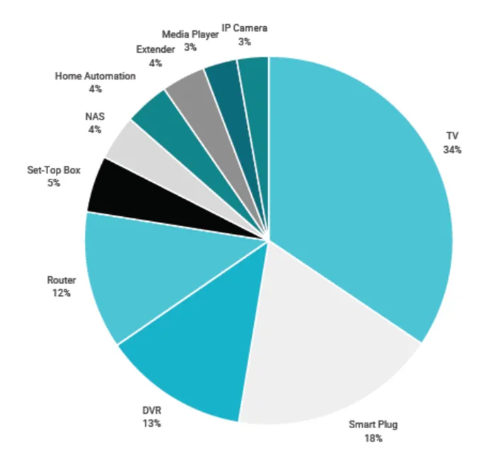 该报告统计了特别容易受到攻击的特定设备,2023年,发现漏洞数量最多的设备包括智能电视机、智能插座、数字录像机(DVR)和智能路由器,占比分别包括34%、18%、13%和14%。其中,电视机由于其较长的使用寿命和最终缺乏软件支持,特别容易受到攻击。虽然这些统计数据主要来自于海外市场,但不少领域国内家庭也需要特别关注,例如、智能电视、智能路由器在国内家庭中已形成高渗透率,需要高度关注针对这些设备的攻击。