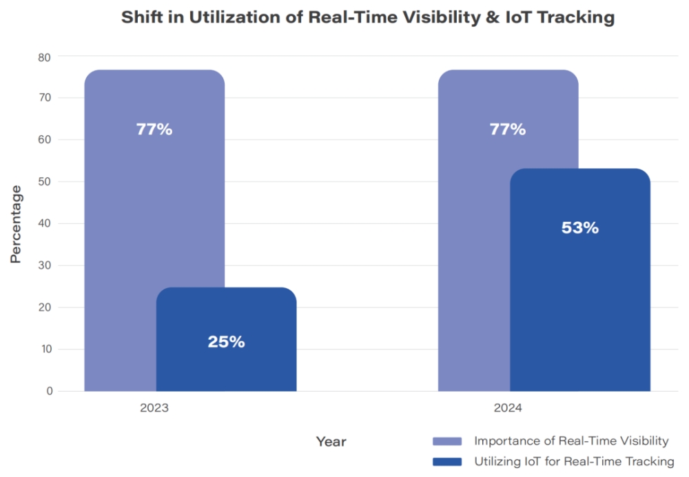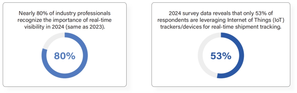 调查数据显示,在2023年和2024年,近80%的行业专业人士都认识到实时可视化的重要性,2024年已有53%的受访者正在利用物联网(IoT)跟踪器/设备进行实时货运跟踪,较2023年的25%有大幅提升。这一趋势凸显了业界对实时可视化在满足客户对透明度和运营效率需求方面不可或缺性的日益共识。