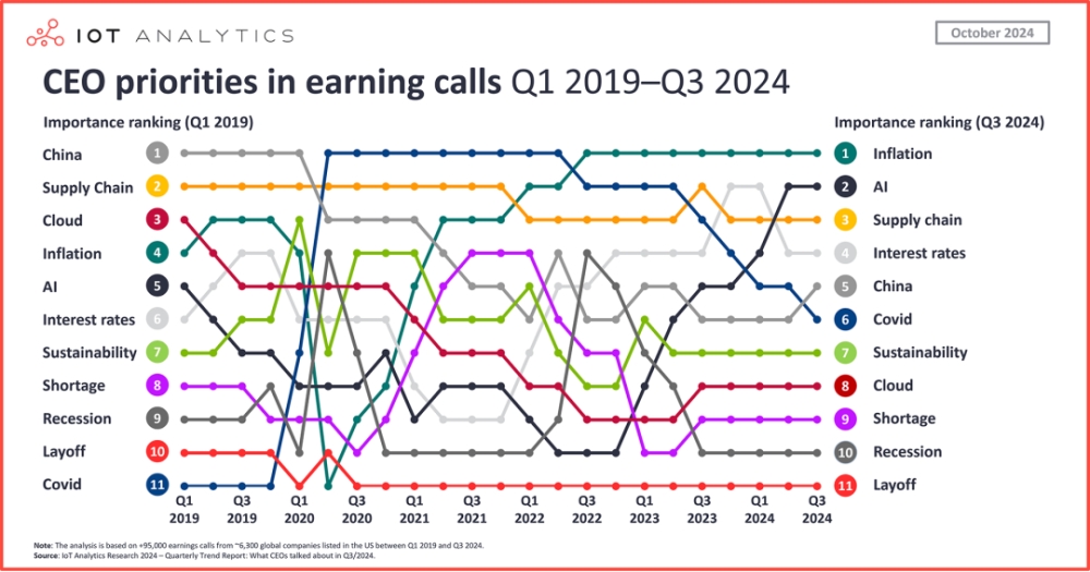 20219 年第一季度至 2024 年第三季度,人工智能的衰落与崛起是 CEO 们常见的讨论话题(图源:IoT Analytics)