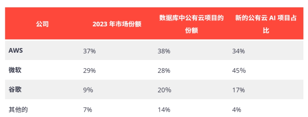 表中的 “其他”包括Oracle和阿里巴巴;但鉴于它们在云端 AI 项目中的份额较小,本文的重点将放前三大超大规模企业,即 AWS、微软和谷歌身上,并比较他们三者的最新云 AI 产品和项目: