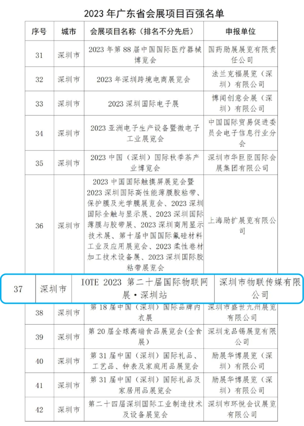 在广东省商务厅公布的2021-2023年广东省会展企业百强和会展项目百强认定名单中,深圳市物联传媒有限公司以其卓越的会展组织能力和创新的展会理念,荣获会展企业百强称号。同时,公司旗下标志性展会——IOTE国际物联网展,以其在物联网领域的深远影响力和专业水准,再次入选会展项目百强名单。