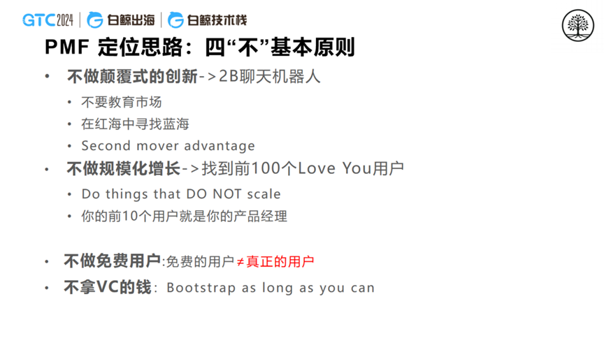 在分享中,栾晓锐提出了“四不”原则:不做颠覆式创新、不做规模化成长、不做免费用户、不拿VC的钱。他认为,在找到PMF之前,创业公司应该专注于打造有价值的产品,而不是盲目追求增长。他通过自己的创业故事,说明了如何通过不断试错和用户反馈,找到产品的市场定位。