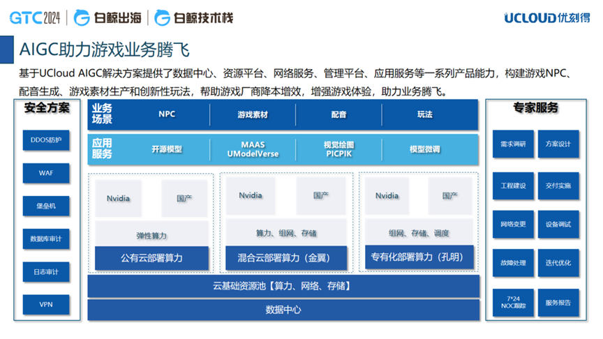 在游戏出海方面,UCloud提供了全面的解决方案,帮助游戏稳定运行,包括本地清洗和高防能力、跨域网络覆盖、游戏服务器部署等。同时,UCloud也支持AIGC在游戏行业的应用,如文生图、游戏素材生成、智能NPC和配音生成等,提供公有云部署的算力模式、混合云精益模式和孔明计算平台等多种服务模式。