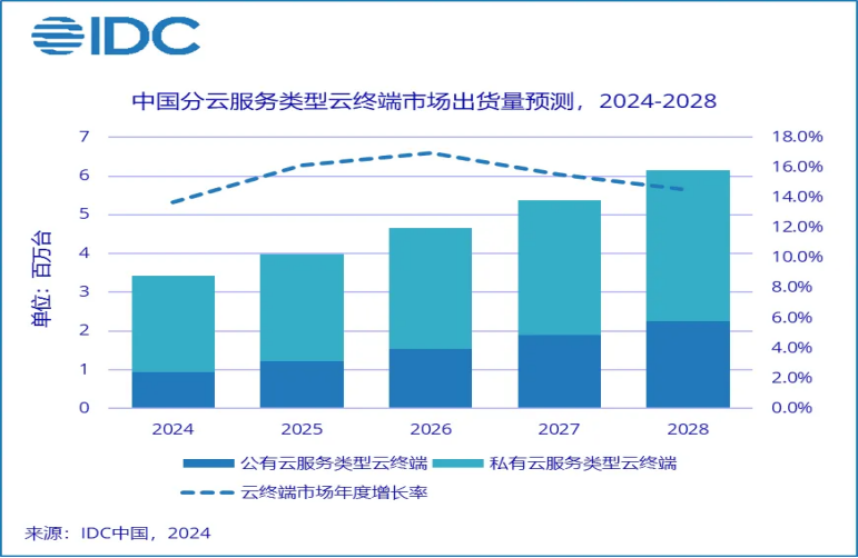 国际数据公司(IDC)最新发布的《2024年上半年中国云终端市场跟踪报告》显示,2024上半年中国云终端市场出货量达到166.3万台,同比增长22.4%。IDC预计,2024至2028年,中国整体云终端市场规模有望超过615万台,五年复合增长率将达到15.8%。通俗来讲,商业模式和产业链条已经打通,最终用户以相对更加低廉的价格拥有云终端设备即“云电脑”服务。