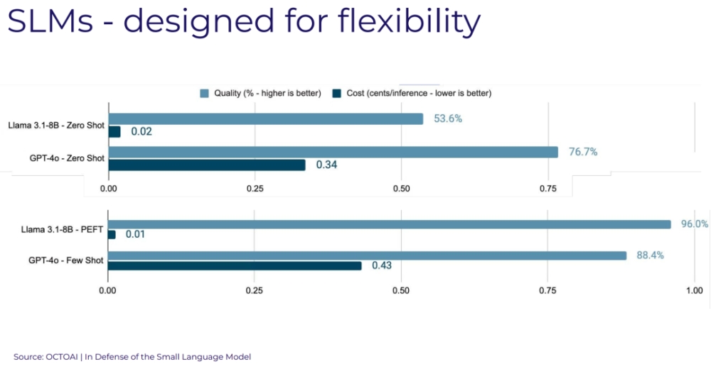 Llama 3.1-8B与GPT-4o的比较进一步证明了SLM在成本和性能方面的优势,见下图。首先,与LLM相比,SLM的运行成本只是其一小部分。在零样本设置中,Llama 3.1-8B的成本明显低于GPT-4o。其次,只需进行少量额外训练,SLM就能在特定任务(如客户支持或法律研究)中达到接近甚至超过LLM的质量水平。最后,Llama 3.1-8B在经过精细调整的设置下实现了超过96%的任务质量,证明了其在重点用例中实现高精度输出的能力。