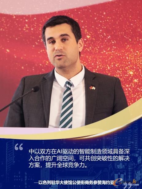 以色列驻华大使馆公使衔商务参赞海约亚(Yoav Haimi)先生发表致辞。他对中以两国在智能制造领域的合作前景进行了展望,强调双方在人工智能驱动的自动化、工业网络安全和智能工厂等领域,具备深入合作的广阔空间,希望双方携手共创突破性的解决方案,共创智能制造的崭新时代。